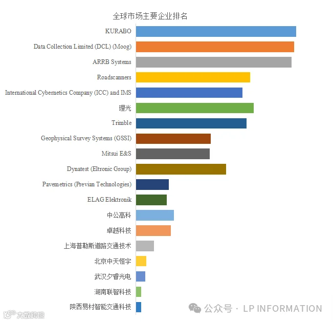 全球范围内,道路检测系统主要生产商包括KURABO,Data Collection Limited (DCL) (Moog),ARRB Systems,Roadscanners and International Cybernetics Company (ICC) and IMS等,其中前五大厂商占有大约44%的市场份额。