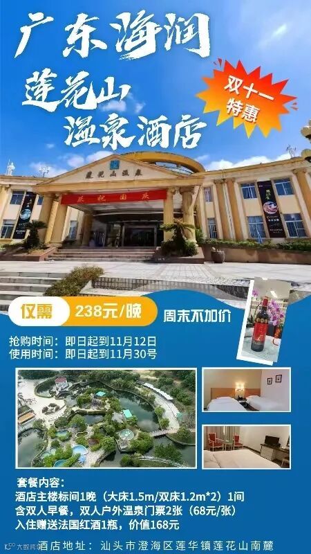 海润莲花山温泉酒店主楼标间(大床/双床)双11特惠抢购活动价:238元。套票内容如下: