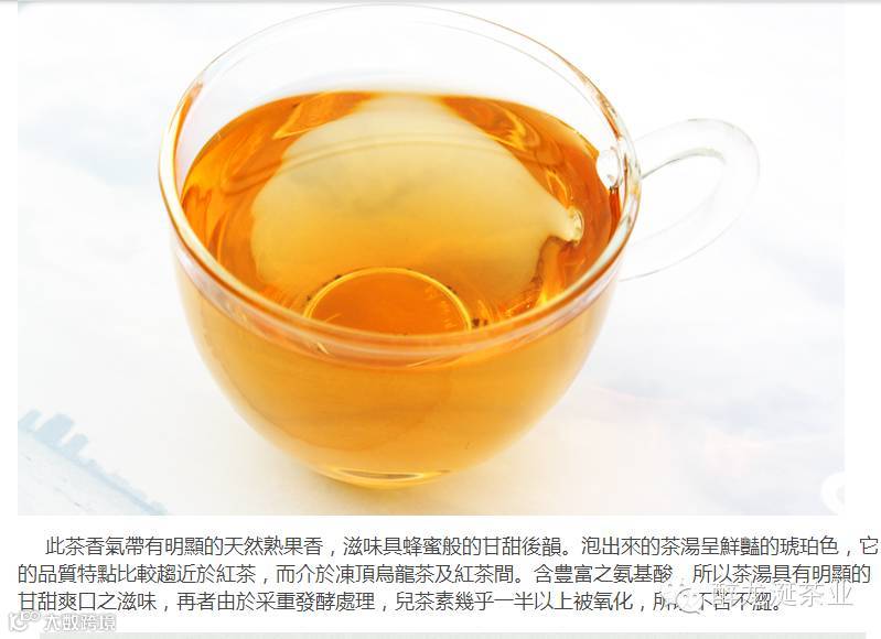 红乌龙外观型壮围半球型,色泽按红带有光泽,茶汤水色琥珀橙红、明亮澄清,茶质厚重剧熟果香,滋味醇厚而圆滑、富有活性,耐泡、甘醇,为冷饮茶的上选材料。