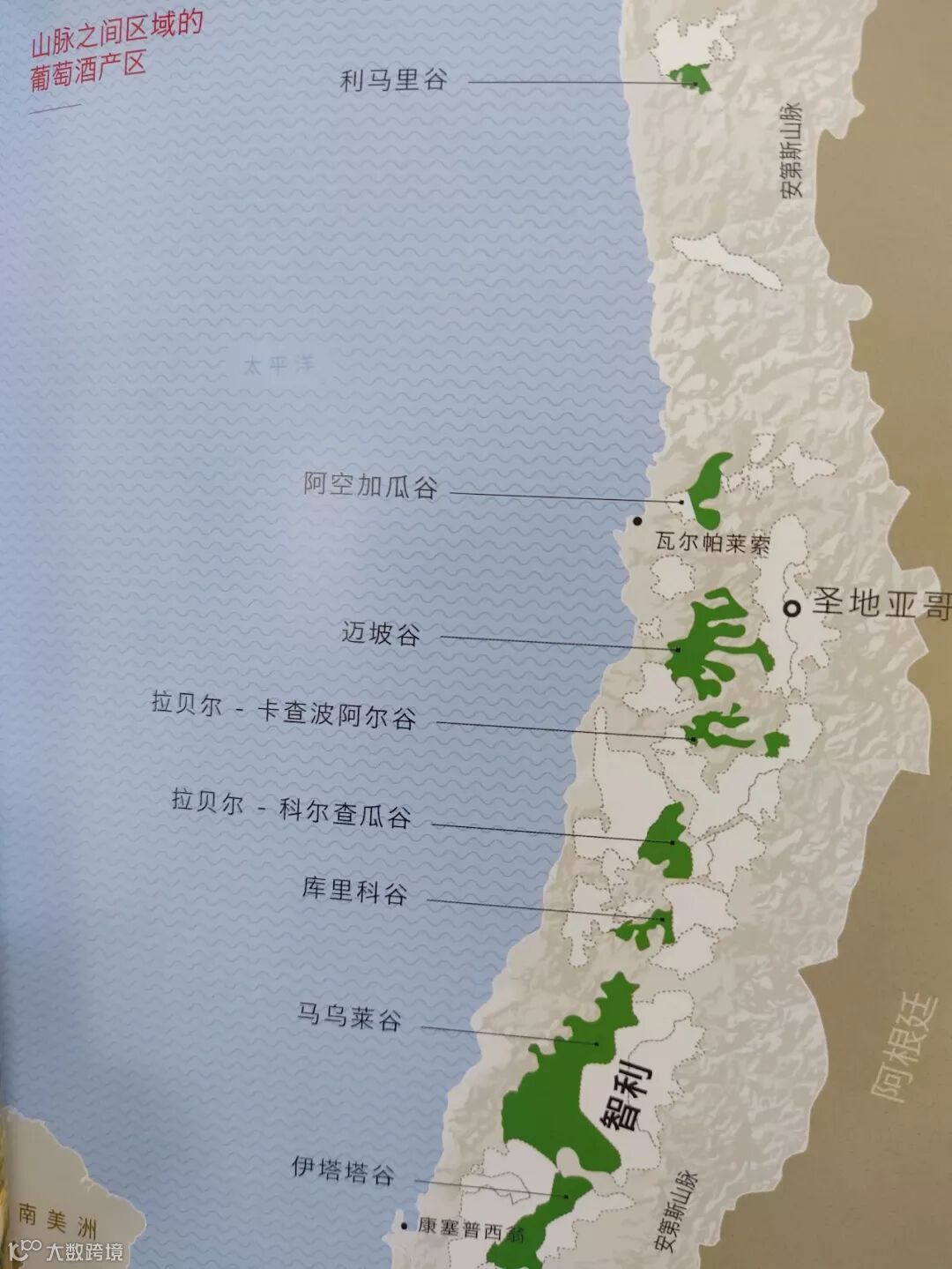 安第斯山脉区域ANDES AREAS,横亘整个南美大陆的安第斯山脉,连绵7000公里,刚好把阿根廷及智利两国隔开,在它的阻挡下,整个智利葡萄园气候产生至关重要的影响,清晨山顶形成的冷空气团,会在白天下行至山谷,大大增加了山脚葡萄园中空气的流动性,从而降低葡萄遭受霜冻、腐病和霉病的发生概率,而较大的昼夜温差能让葡萄藤缓慢生长,让葡萄保持良好的酸度,出产清爽而优雅的优质葡萄酒。安第斯山脉葡萄产区由北往南依次分布:埃尔基谷、乔阿帕亚谷、阿空加瓜谷,麦坡谷、拉贝尔-卡查波阿尔谷、拉贝尔-科尔查瓜谷、库里科谷、马乌莱谷。
