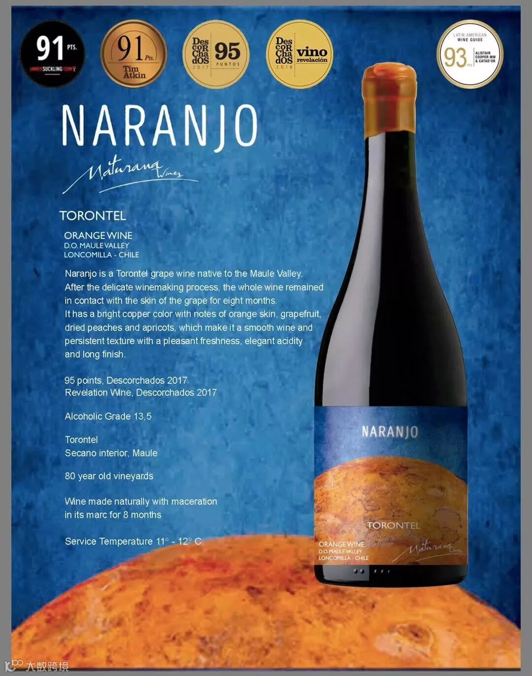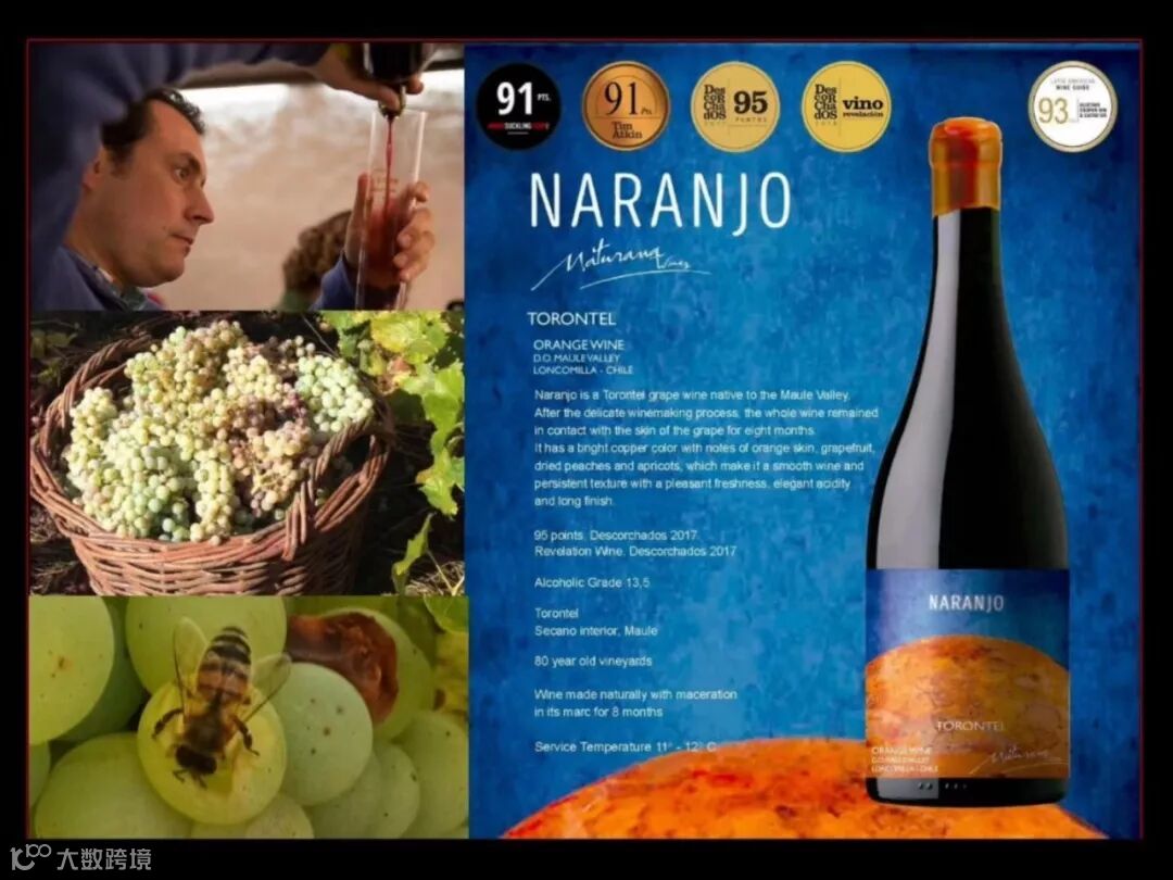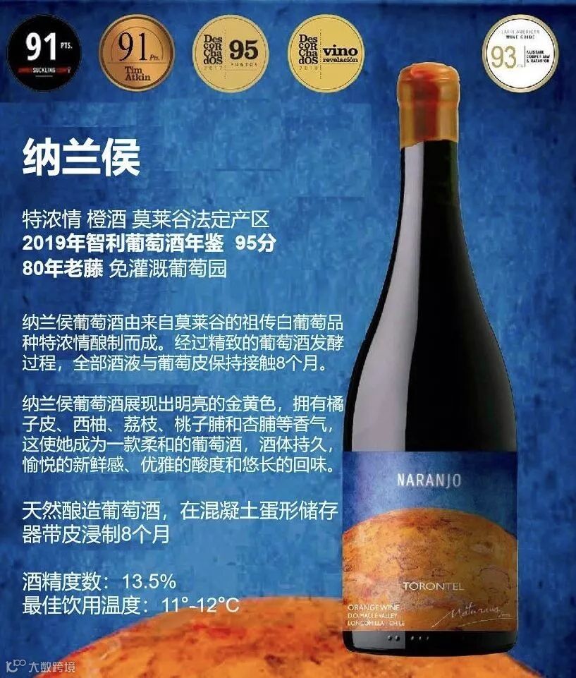 此干白精挑细选超过80年的Torontel老藤特浓情葡萄使用自然酿造法精心酿造,不放橡木桶,只在蛋型混凝土发酵罐控温发酵八个月,酒质纯净,酒香复杂,酒味醇厚。品醇客杂志DECANTER评91高分,世界著名葡萄酒大师Tim Atkin MW及James Suckling先生评91高分,而智利的葡萄酒年鉴更高评95高分,可谓好评如潮。{白葡萄酒能评95分的极少极少,只有极少数超高品质的酒可以评上,法国勃艮第的特级田很多也评不到},此橙酒包装精美酒标鲜艳动人,手工蜡封瓶口,可谓:形象出众,秀外慧中,绝对是橙酒中的顶级佳酿,干白中的翘楚。