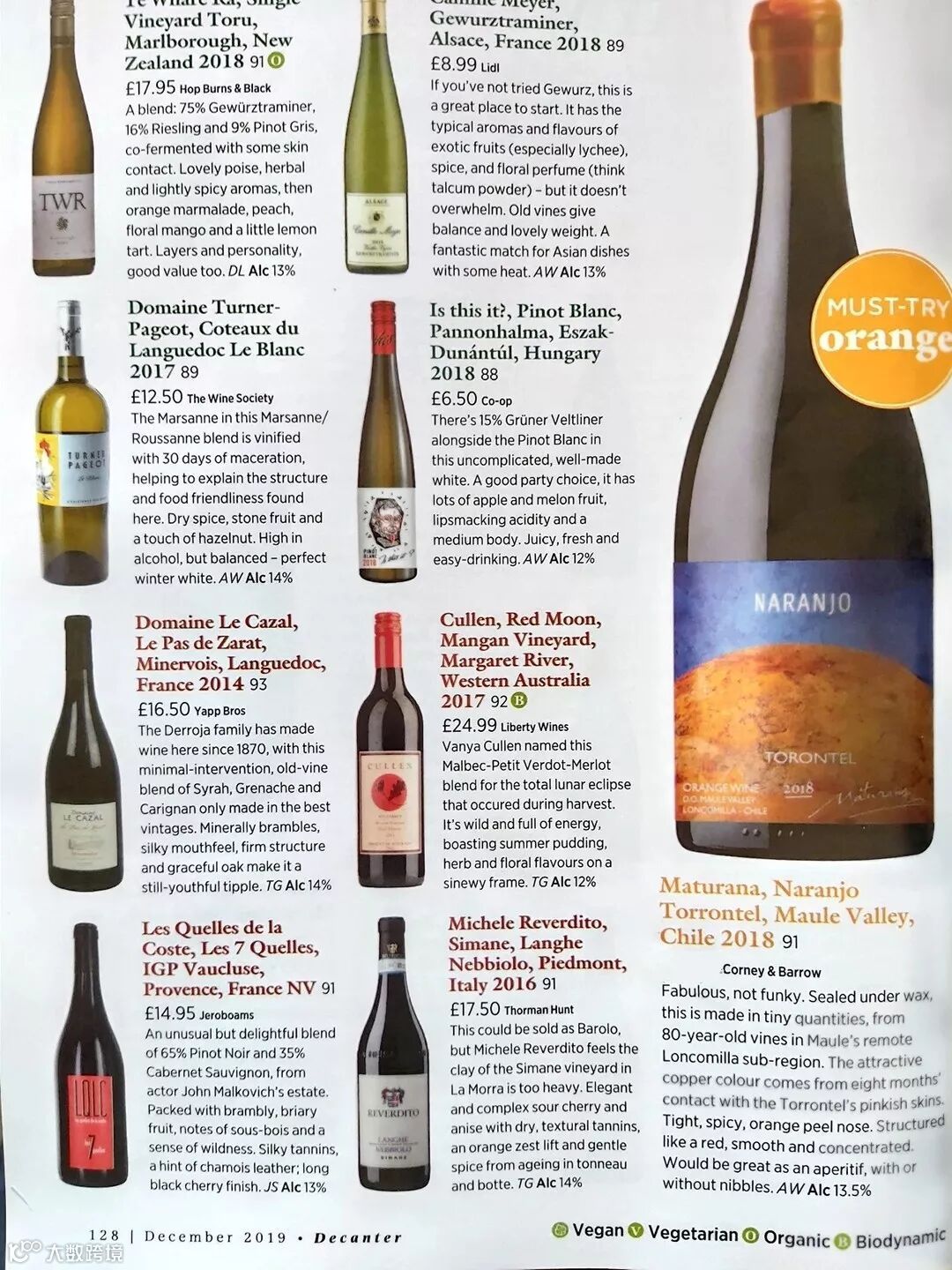 喜讯喜讯,全球最著名的葡萄酒杂志:英国品醇客DECANTER最新一期12月WEEKDAY WINES版,特别推荐来自智利著名产区D.O.MAULE VALLEY中的小产区LONCOMILLA家族企业马图拉纳酒庄MATURANA WINERY出产的限量干白葡萄酒{橙酒}:2018 NARANJO。{有名有姓,有书为证}
