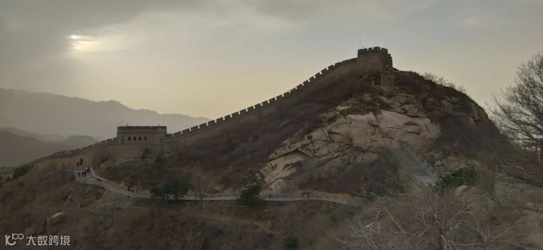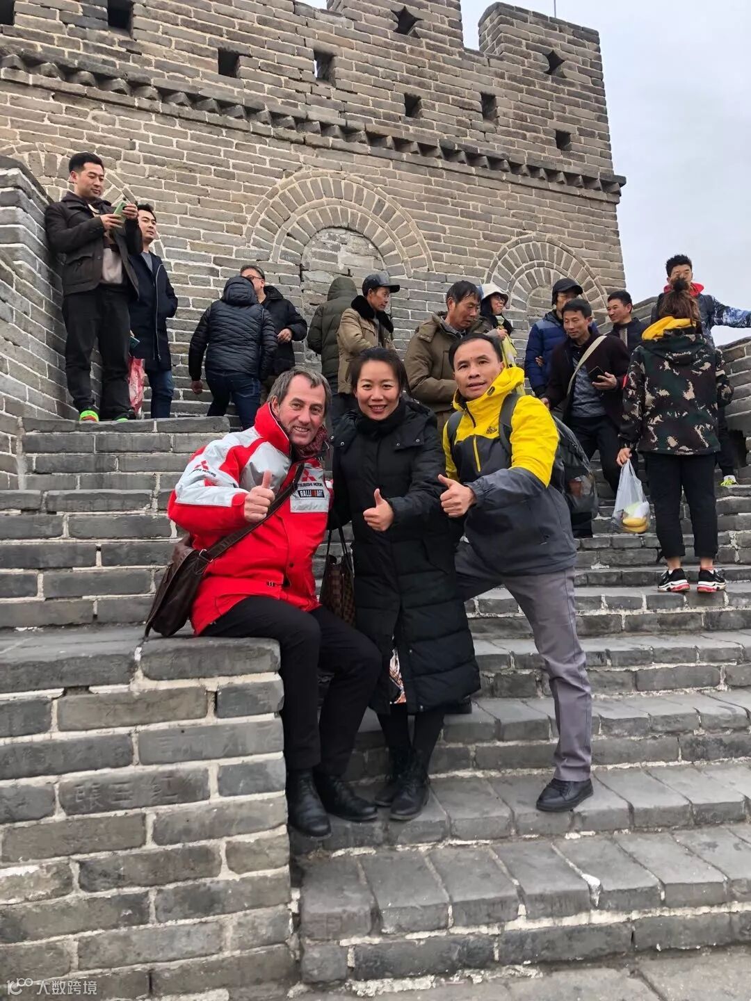 大伙回办公室收拾东西后总经理助理王小姐接我们去镇上午饭,大家边吃边讨论品种、酿造及酒质相关问题,对以后的合作有了更好的了解基础。午饭后互相道别我们上车赶去中国名胜古迹之一的:北京八达岭长城 参观。{去机场的必经之路,趁有时间去看看}。到达长城景区门口我们和司机说好后即刻坐接送巴士到索道门口,买票坐缆车里慢慢上山,八达岭长城景色尽收眼底,一直只听说没亲眼目睹,现在亲临其境,有点小激动,{但天色昏暗,北风呼啸,影响观赏},我们出缆车后走到长城,只见梯级的青砖及一些石块都被磨得一个一个坑或一道一道痕,历史的痕迹,极其沧桑。我们迈开步喘着气奋力攀登,老佛爷先生更兴奋异常,因为想也没有想到,匆忙工作中竟然做了一回:中国好汉子{REAL MAN},不到长城非好汉,绝对是全球最成功的广告语。大家观看长城两边山景一会又合影留念,即刻又坐缆车下山回大门口,继续去机场的行程。