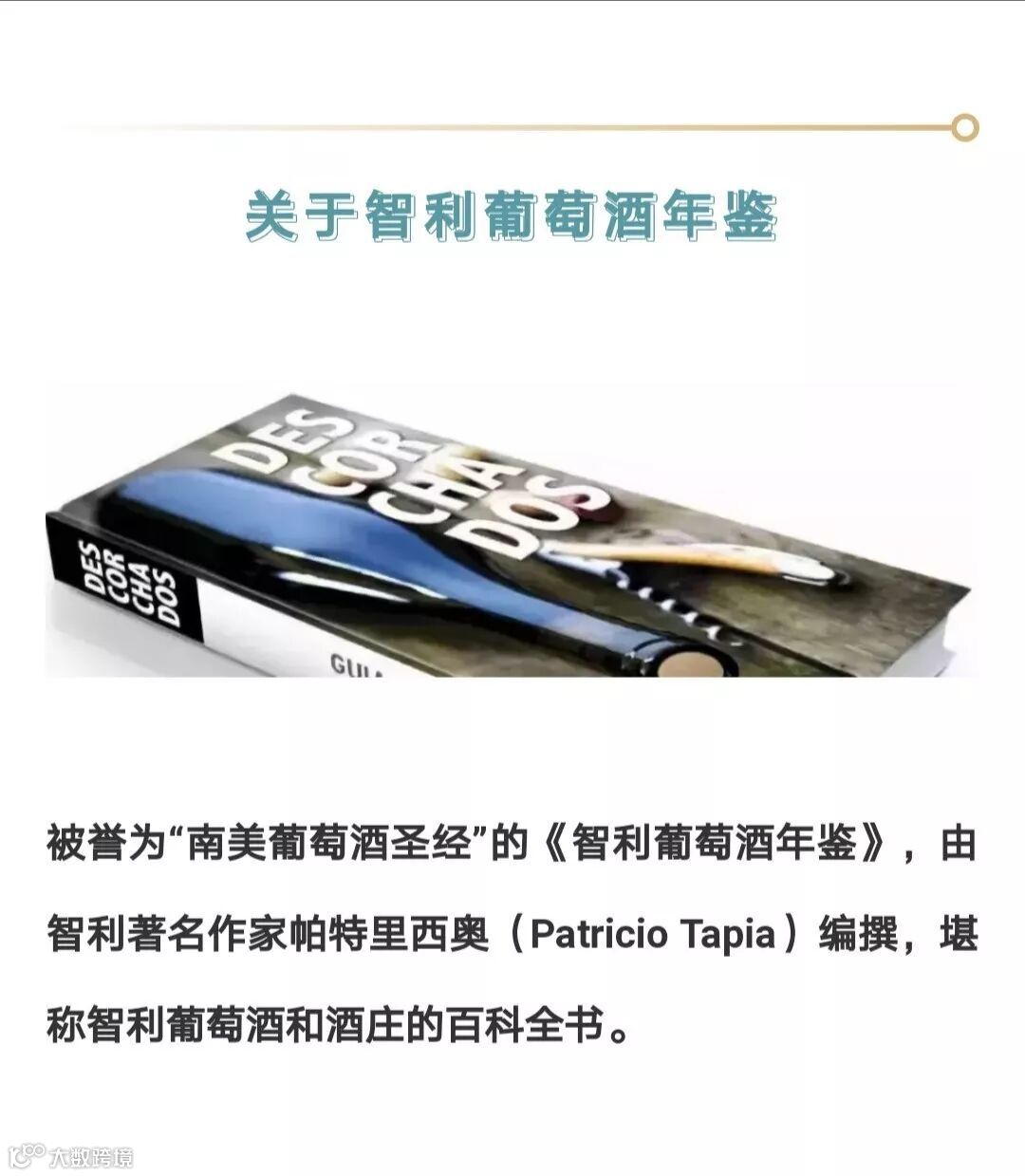 智利葡萄酒年鉴由南美洲最权威最资深最专业的国际酒评家 PATRICIO TAPIA帕特里西奥.塔皮亚先生主导撰写,塔皮亚先生早年修读完智利圣地亚哥大学新闻系后就远渡重洋到法国波尔多大学研习葡萄酒知识,既学习理论更到酒庄下田耕作,到酿酒厂学习酿造葡萄酒,理论与实践结合,使塔皮亚先生的葡萄酒专业知识及经验有了巨大提升,之后他更踏遍世界的酿酒国家及产区,实地考察广泛接触,也去世界各大葡萄酒比赛担任专业评委,成为葡萄酒行业的行家里手,在积累多方经验同时,他不断撰写多篇国家和产区的酒庄见闻及品鉴评价,由此成为国际知名的葡萄酒品鉴专家及作家,这本智利葡萄酒年鉴就是其得意之作之一。