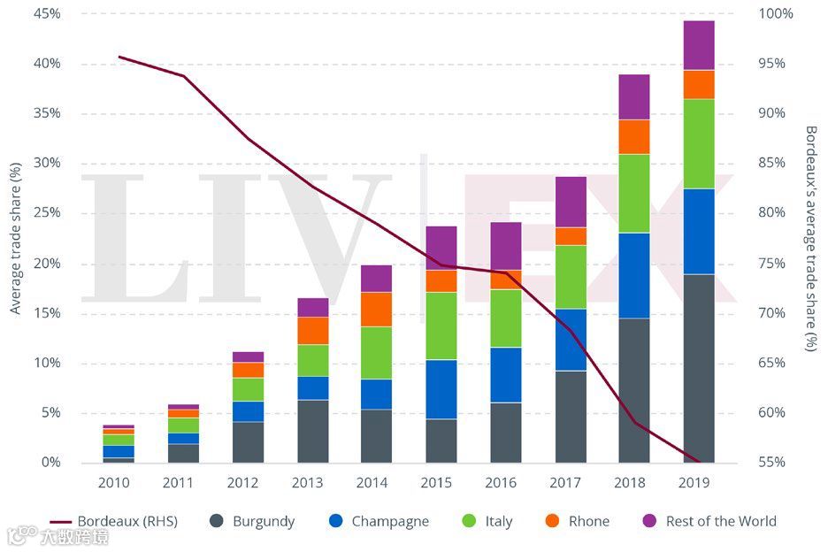 自2010年以来,波尔多的市场份额一直持续下跌,由2018年度的59%跌至今年的55%;而 8月份更跌至历史新低的45%。