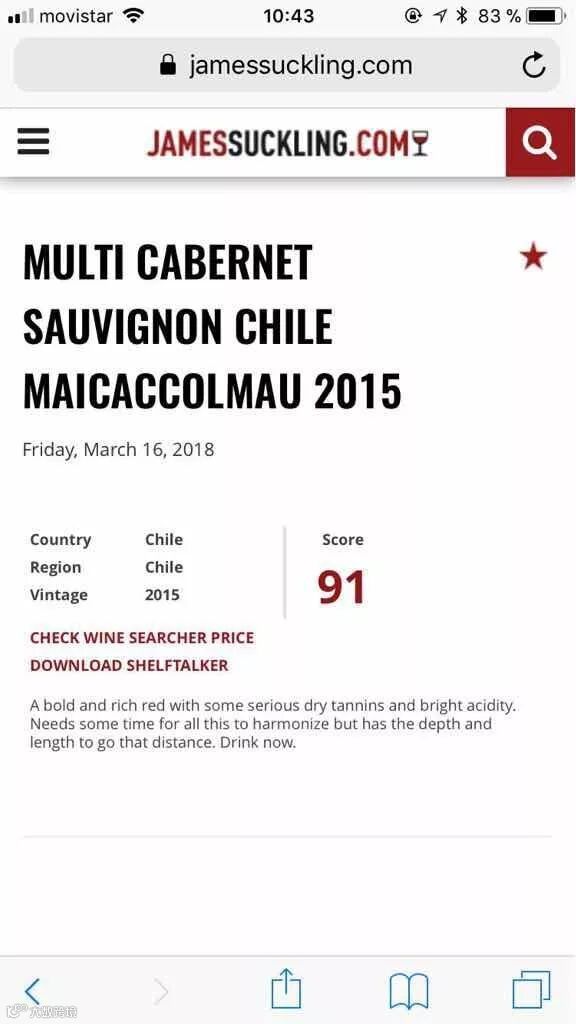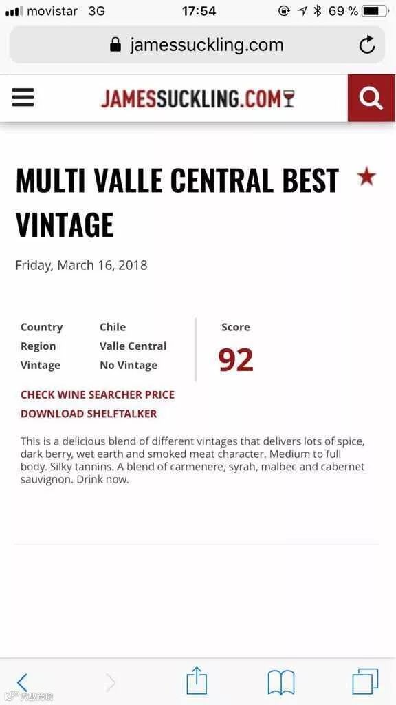 最佳年份是高品质的混酿。这是一支经过严格挑选使用2012/2013/2014/2015四个年份智利最好的葡萄酿造后混合而成的佳酿。这款高端葡萄酒融合了智利不同年份、不同山谷、不同葡萄品种的各自特色,其特佳酒质在每一瓶酒中都有突出表现,是大融合与众不同的“口味三部曲”。此酒在3月26号被世界最著名的品酒大师JAMES SUCKLING先生评92高分,有名有姓,有书为证,有姿势有实际,有实力有表现。