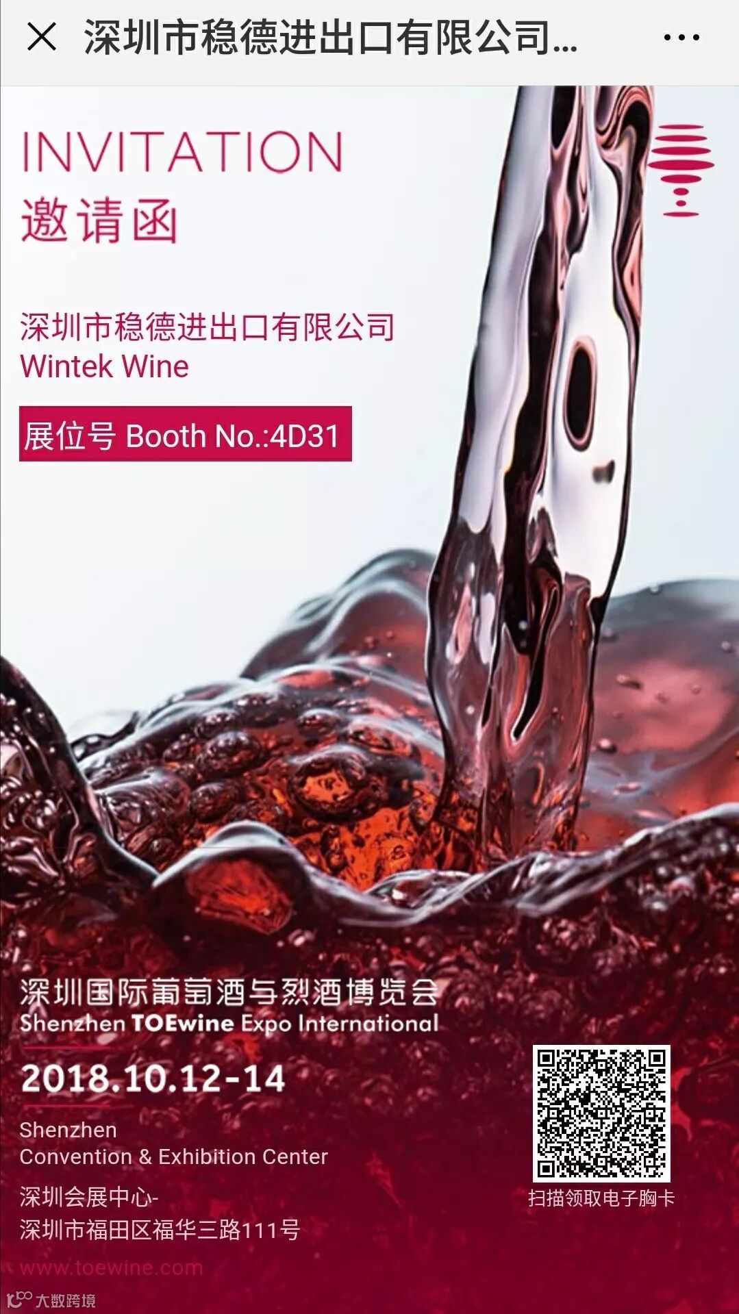 本周五(12号)起一连三天,稳德公司诚意邀请各位莅临深圳会展中心4号馆本公司展位:4D31 现场参观交流试酒洽谈,公司将现有酒款尽数摆展,一定让各位来宾乘兴而来尽兴而归,而宝松J.BOUCHON家族酒庄驻华代表:赵飞先生 也不远千里专程由上海来到深圳,与公司同事一起恭候各位大驾光临!希望与各位来宾携手并进!互惠互利!合作双赢!