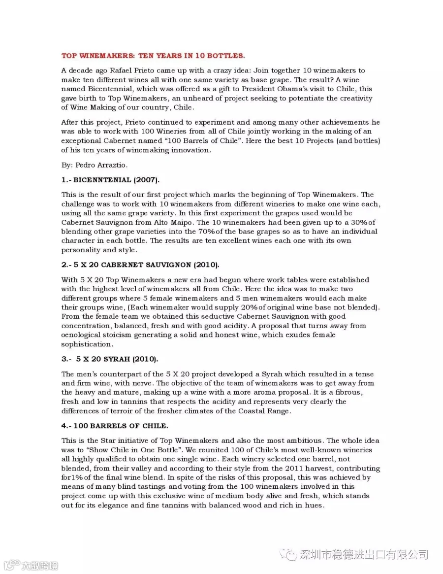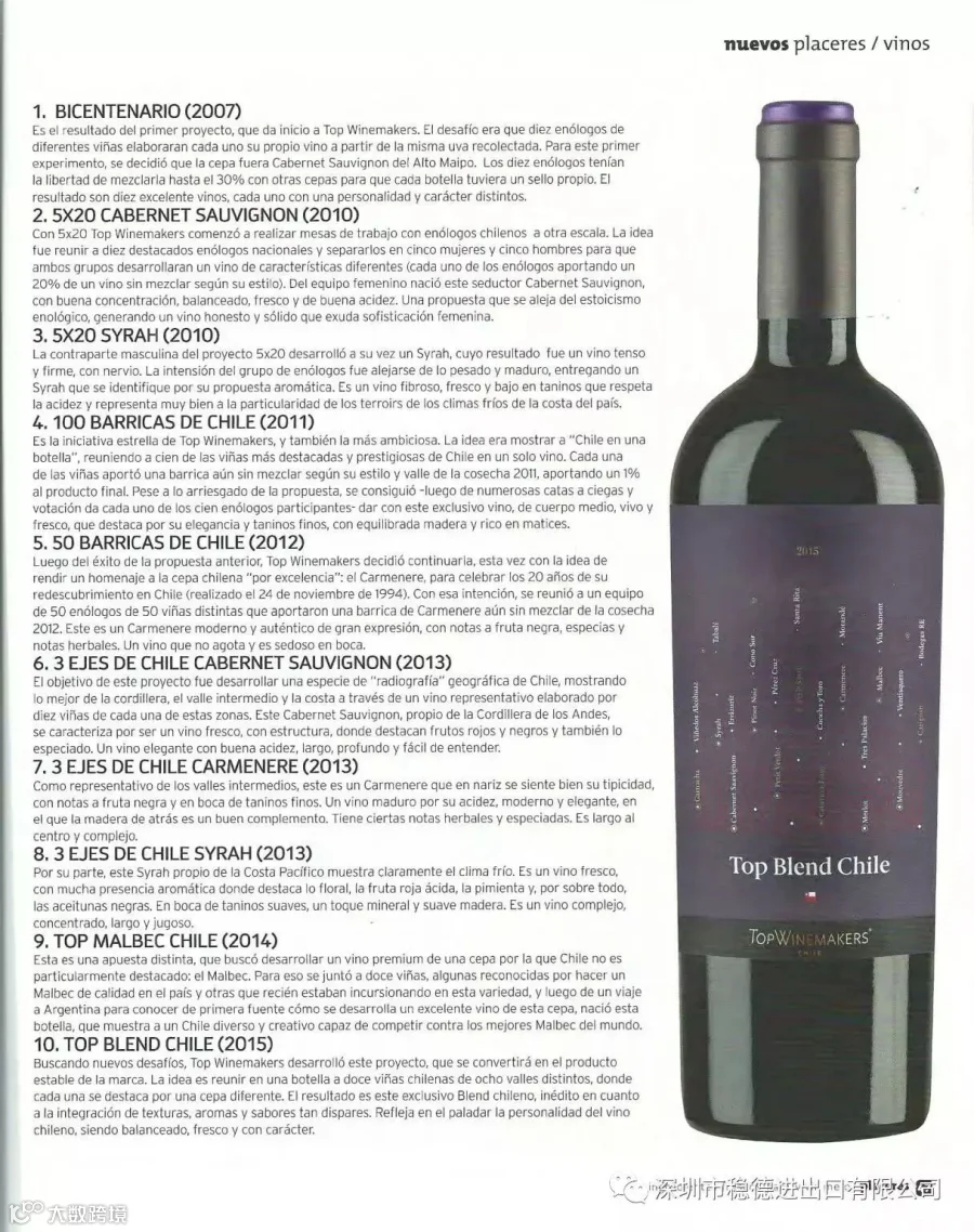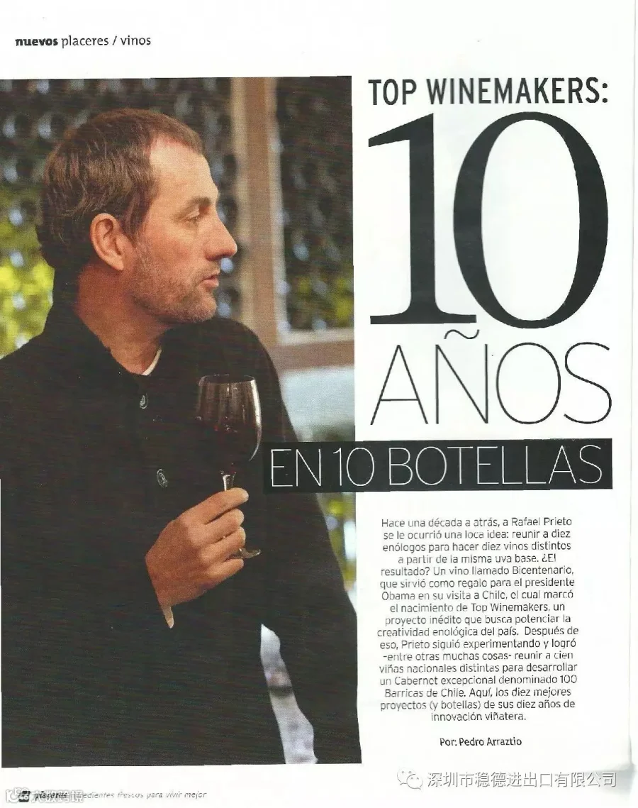 深圳市稳德进出口有限公司 Top Winemakers智利顶级酿酒师创始人“老佛爷”(Refael Prieto)又上智利的Placeres杂志了,智利顶级酿酒师10周年加上智利顶级混酿的盛装出席。
