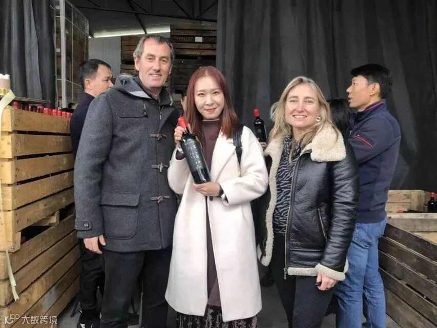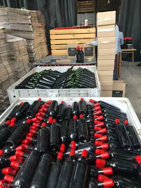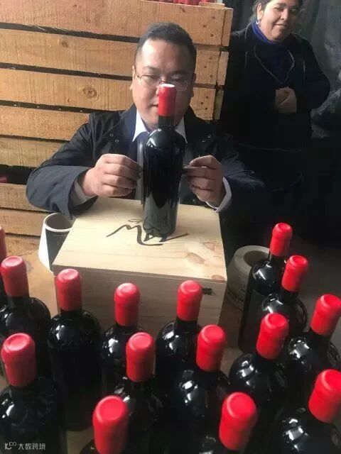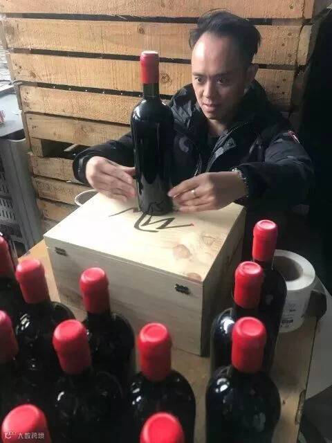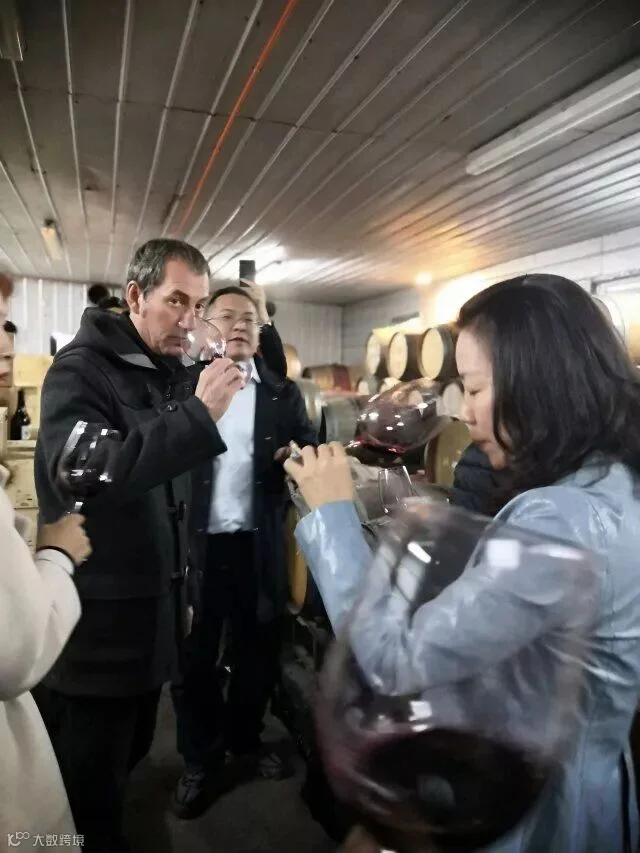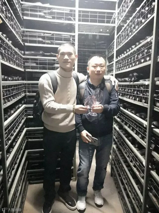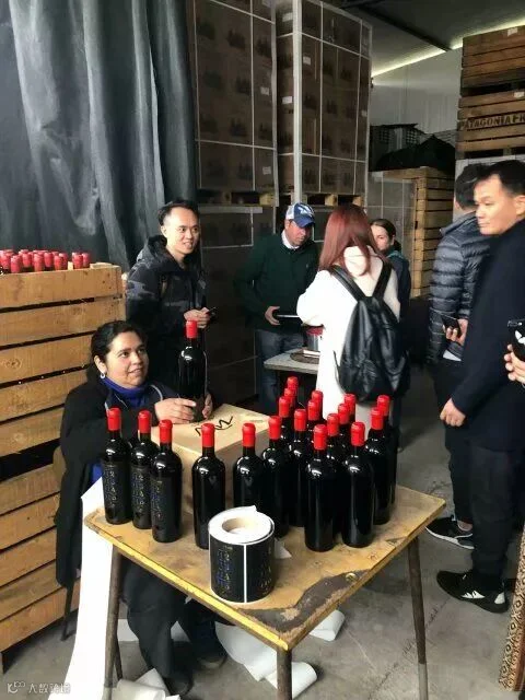 接着他带大伙进酒庄装瓶间,首先看到工人在手工蜡封妙极最佳年份,此批酒销往韩国,所以背标是韩文。{瓶口先倒放进融化的红色蜡里,沾满后拿出来转几个圈,让蜡均匀留在瓶口位置让其慢慢干燥},在贴酒正标背标及詹姆斯萨克林的评分标签工作台,团队的每个人都一一尝试,自己亲手蜡封、贴标,老佛爷及酿造厂负责人在酒标上签名、合影留念,作为礼物赠予我们每个团友。