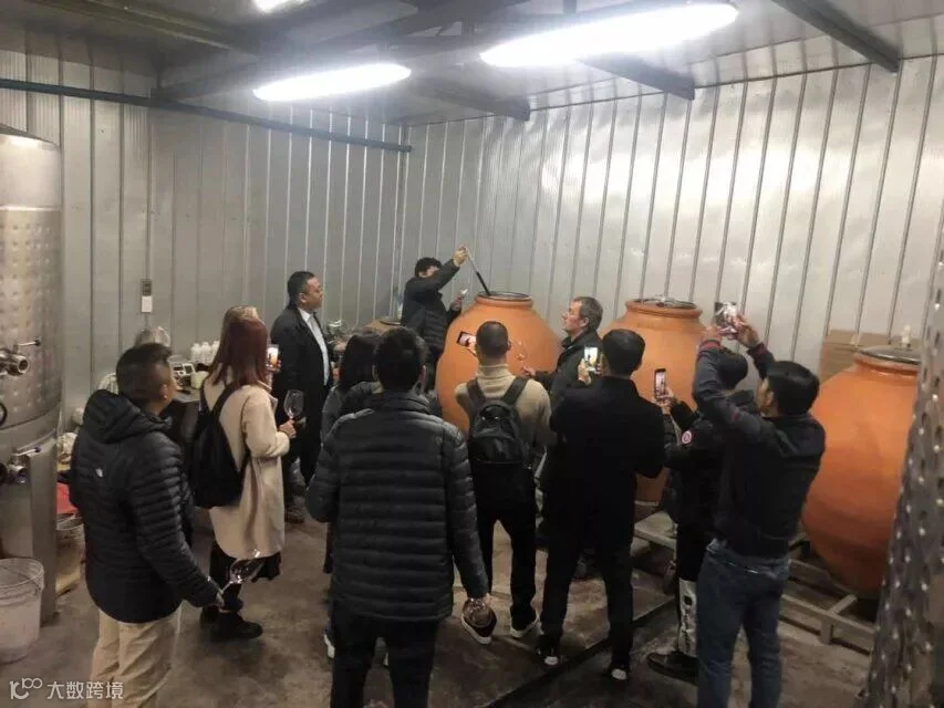 然后又来到不同的发酵桶与储存罐讲解及试喝,从不锈钢桶到橡木桶、陶土罐,特别是蛋型发酵罐,从最新年份到老年份,主要是妙极系列的不同葡萄品种,试喝的同时配有点心与新鲜水果,再去瓶存室参观,每个人找不同的位置与角度拍照,最后集体拉条幅合照留念,在这度过了一个愉快的中午时光。