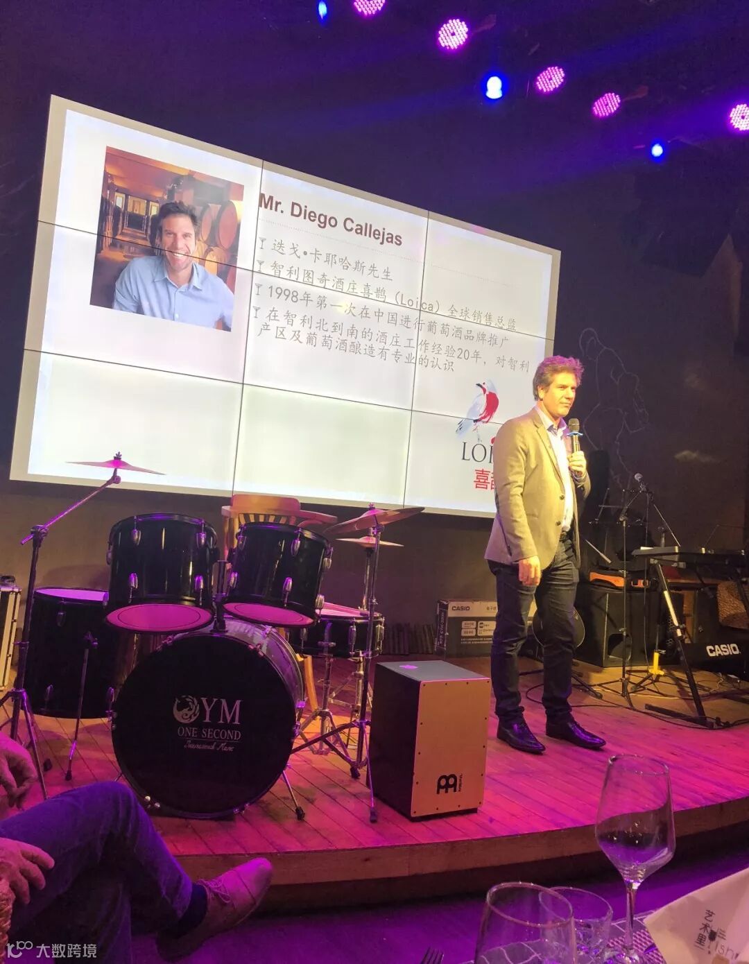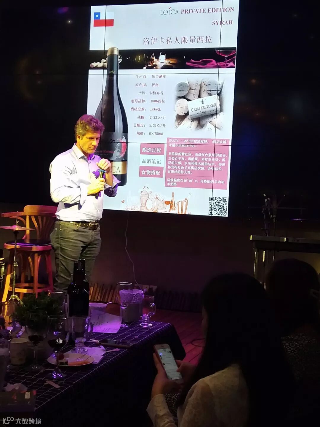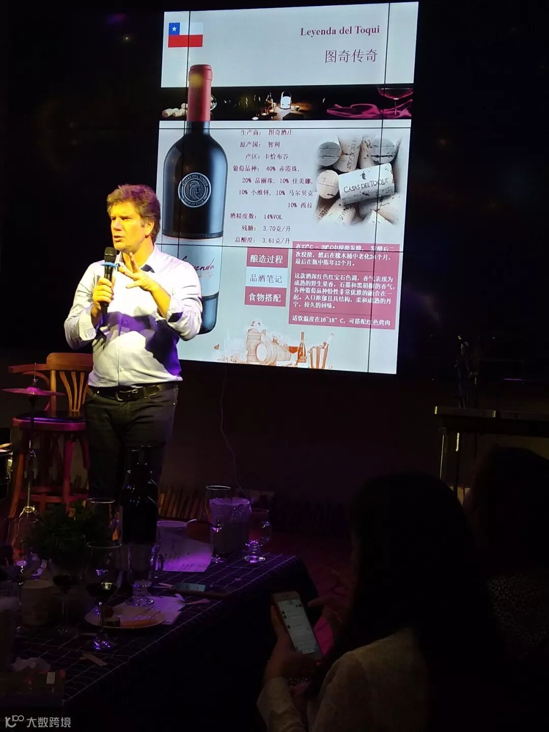接着是销售总监DIEGO先生出场,他对着PPT图片逐一介绍侃侃而谈,对酒庄环境、酿造及酒品极其熟悉,说得头头是道有板有眼,嘉宾们听得如痴如醉,收获良多,进入品酒环节,DIEGO举杯带大家逐一品鉴讲解,宾客们都洗耳恭听跟着他细心品鉴,品鉴完三款酒主持人请大家离座就餐,过一会再继续品鉴两款贵酒,宾客们边吃边喝,气氛热烈而融洽。在品鉴两款酒庄顶级酒时,DIEGO逐一解说,深入浅出,让宾客们了解美酒知识同时也喝到顶级品质好酒,度过一个愉快又受益的晚上,品鉴完毕后大家再次报以热烈的掌声感谢DIEGO声情并茂的演讲。