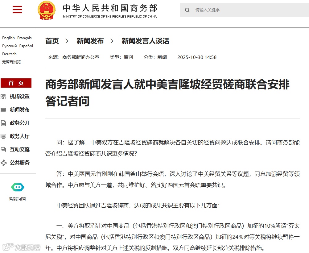 2025年10月底,中美双方经贸团队在马来西亚吉隆波举行磋商,就多领域核心议题达成共识。随后两国官方分别发布会谈有关内容。
