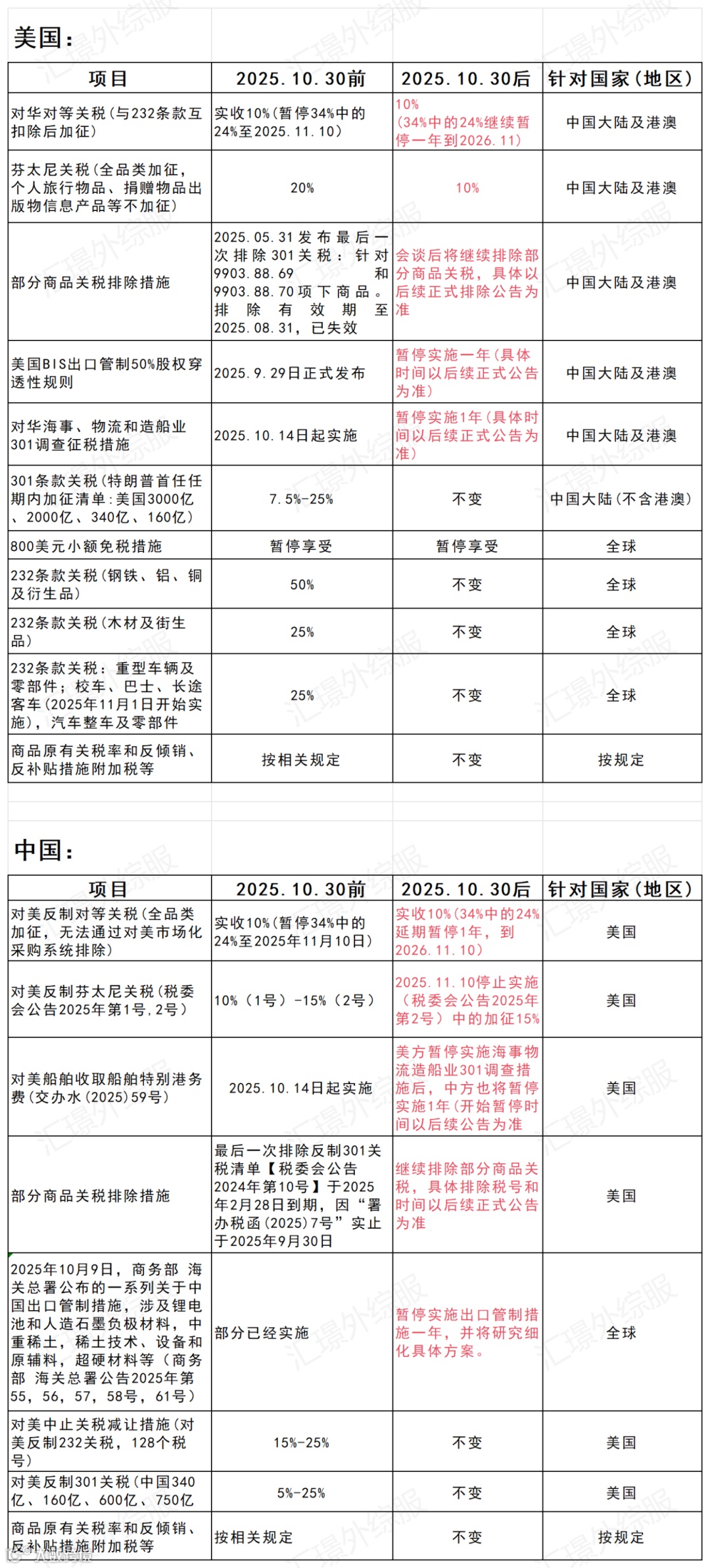 | 关税 | 取消针对中国商品加征的10%所谓“芬太尼关税” 对华加征的24%对等关税继续暂停一年 |