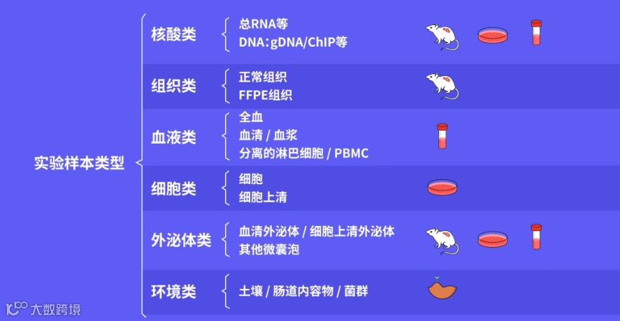 分子实验中主要的样本类型有:纯核酸类、组织类、细胞类及环境类。不同样本具有不同的保存方式以及操作注意事项。