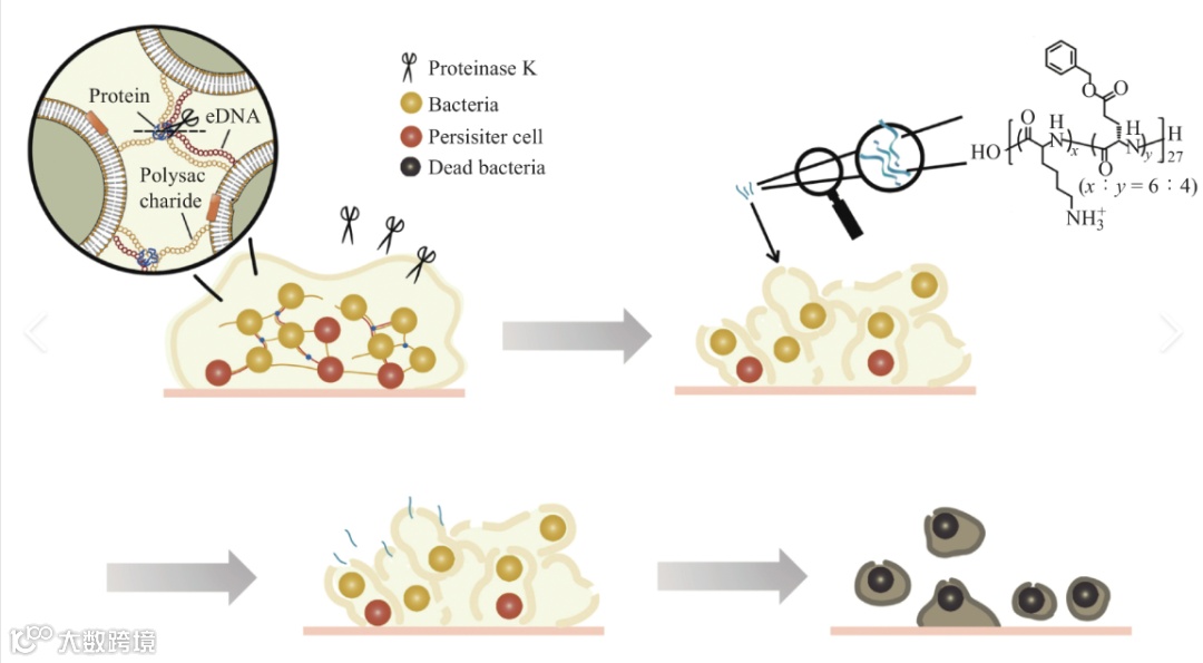 图 1 蛋白酶K和P(DLL-co-BLG)联合作用清除MRSA生物被膜和持留菌的示意图