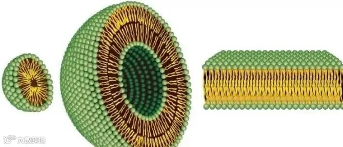 图3 胶束(左)、脂质体(中)和脂质双分子层(右)的空间结构