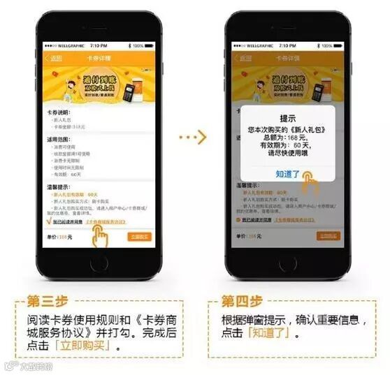 通付Mpos新用户注册7天内,登录通付App,在【卡券商城】内购买168元手续费抵扣券大礼包(内含价值168元的手续费抵扣券1张,有效期60天),即享激活达标奖励。