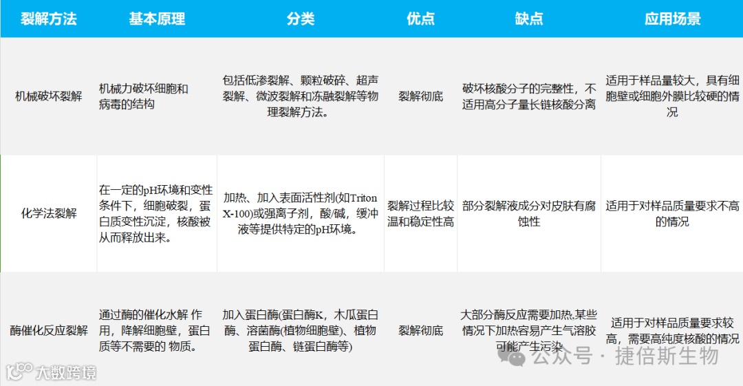 核酸提取的第一步是样品裂解,释放核酸,该过程目的主要是将细胞或病毒中的核酸分子与其它生物大分子,如蛋白质,脂质,多糖链等,从细胞中释放。主要通过机械破坏、化学作用、酶催化反应三种方法的一种或组合实现,这三种方法的