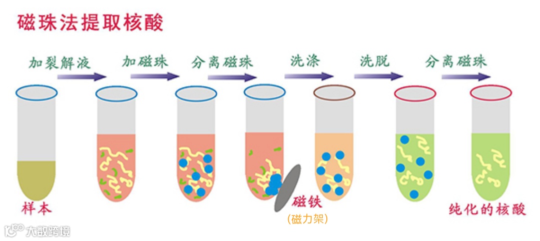 原理:磁珠是有磁性的能吸附DNA的物质,其内部核心是铁离子,在磁场作用下可以吸附在磁体上。在核心外,经过羧化,带有羧基基团,在特定的离子条件下,可以与DNA结合。结合后,在外磁场的作用下,磁珠与DNA结合体移动到磁体周围,可以很方便去除其他多余的液体,这时,不能与磁珠结合的所有杂质都随水溶液一并去除。然后,在洗脱条件下,DNA与磁珠分离,溶解在水中,将溶解有DNA的溶液转移,就得到了纯化后的DNA样本。