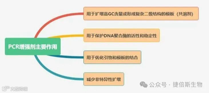 PCR增强剂是可以改善PCR技术的灵敏度、特异性、保真度等的一类添加剂,可以显著改善假阳性、假阴性或无法扩增等情况。当调整循环数、镁离子、引物、dNTP、DNA 聚合酶和 DNA模板浓度等优化方案无法解决问题时,在体系中添加PCR增强剂可以提高含高GC含量或连续多个A/T的复杂基因的PCR扩增效率及扩增特异性,通常在PCR反应体系中添加增效剂。捷倍斯生物可为广大科研人员提供质量高、适用性广的两种PCR增效剂,下面对PCR增强剂的分类及作用进行简单介绍。