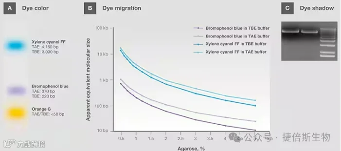 图 9. (A)中性pH中染料颜色。(B)在TAE和TBE缓冲液中不同百分比琼脂糖里的染料迁移。(C)在可视化过程中染料阴影遮盖条带。 图源:Thermo