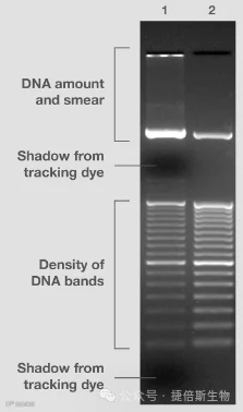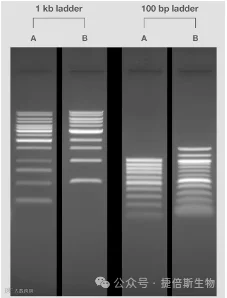 图 6.DNA 分子量标准差异。 分子量标准 #2由色谱纯化的DNA片段组成,存在于上佳的上样缓冲液中,可产生相等或预期强度的条带,并且不含有条带污点,无染色阴影。与此相反,分子量标准 #1采用较老技术制造,并存在于次优组分的缓冲液中。图源:Thermo