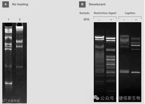图 10. 热量、SDS对样品电泳的影响。(A) 在不加热处理的情况下,将含有RNA分子量标准的变性缓冲液加入凝胶中。 (B) 在有或无SDS的上样缓冲液中准备来源于限制性内切和连接反应的DNA样品。在凝胶上样前,加热SDS中的样品。 图源:Thermo