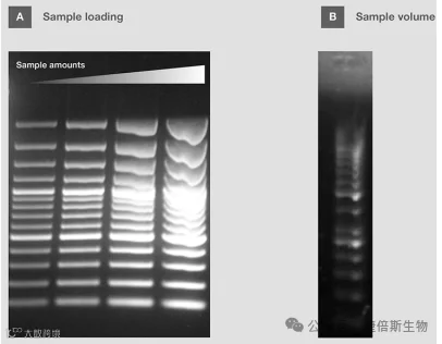 须计算上样到凝胶中的DNA量,以确保目的条带良好分离,并用于可视化和检测。虽然用荧光染料足以检测1 - 100 ng/条带的DNA,但最小可检测量取决于 所用染料(了解更多: 核酸染色特性)[6]。注意,样品或标准品的超载会造成条带污点并遮盖附近条带,从而导致条带分辨不清,特别是片段大小相似时(图8A)。