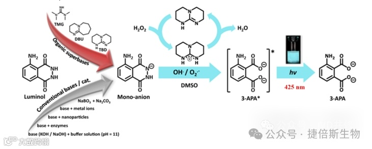 鲁米诺是一种强效的化学发光物质,通常在中性溶液中以偶极离子(两性离子)形式存在。在碱性溶液中,它转变为二价负离子,并可被氧分子氧化为能产生化学发光的中间体。在氧化剂的作用下,鲁米诺被转化为激发态,随后激发态衰变回基态并发出荧光。鲁米诺发光的原理与羰基化合物的亲核加成相关,产生的荧光为蓝光,波长为425nm左右。这类化合物的发光特性为辉光型,发光时间可持续30~60min,启动发光反应后约2min发光强度达到最大。因此反应时间较长。由于底物在没有酶的情况下也有一定的发光因此一般本底较高;酶促反应可以放大发光过程,酶促化学发光一般灵敏度较高(样本的阴阳性分的较开);酶促化学发光对酶的纯度和工艺较高,标记物成本会略高;酶分子量较大,可能引起免疫反应导致产生抗体,需要警惕酶分子引起的假阳性。