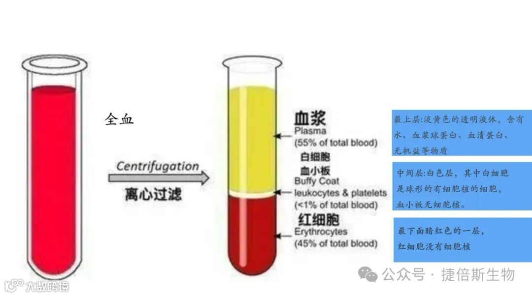 首先,将全血样本进行离心,以分离血液中的红血细胞(RBCS)、白血细胞(WBCS)和血小板。离心后,上清液中含有RBCS和WBCS混合的细胞组分。血样各种成分中,只有白细胞含有DNA。