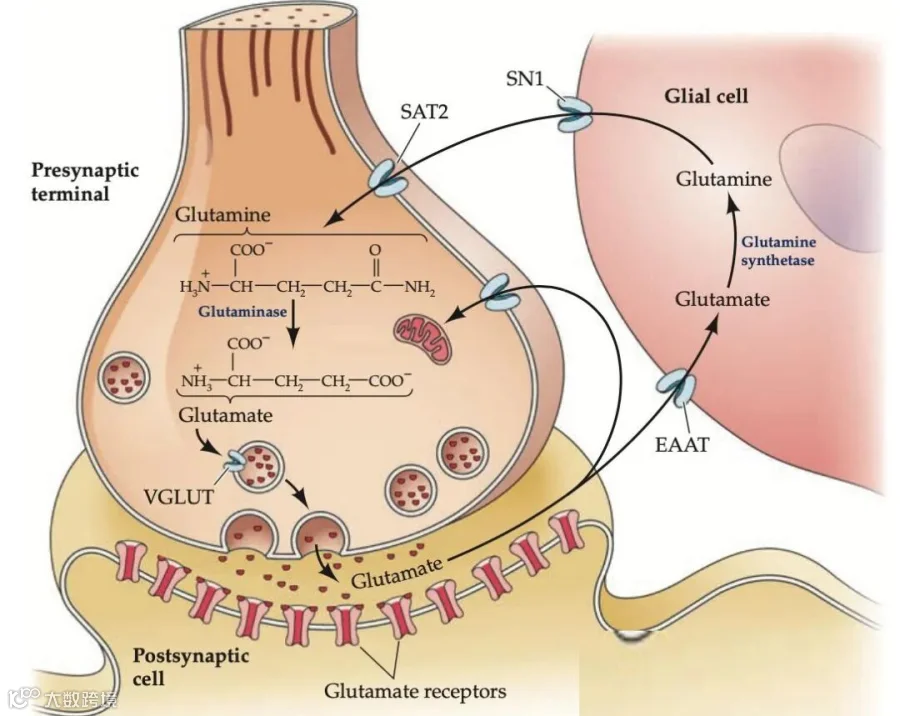 谷氨酸的合成依赖“谷氨酸-谷氨酰胺循环”途径,在神经元中,谷氨酸由其前体谷氨酰胺在谷氨酰胺酶的催化下生成,再经过VGLUT转运体进入囊泡中释放入突触间隙发挥作用。