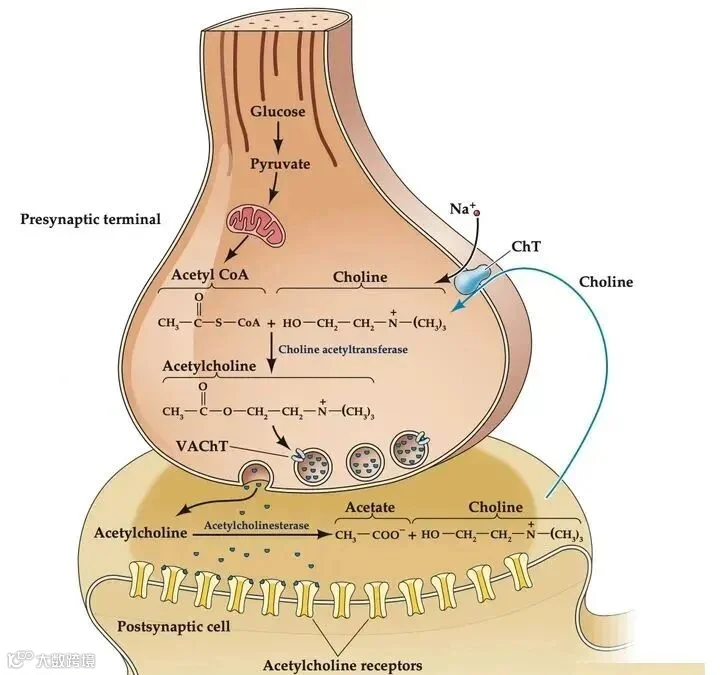 乙酰胆碱刺激肌肉,在自主神经系统和感觉神经元中起作用,并与快速眼动睡眠有关。许多毒物通过阻断乙酰胆碱受体起作用。例如肉毒杆菌素、毒芹和铁杉。阿尔茨海默病与乙酰胆碱水平的显著下降有关。