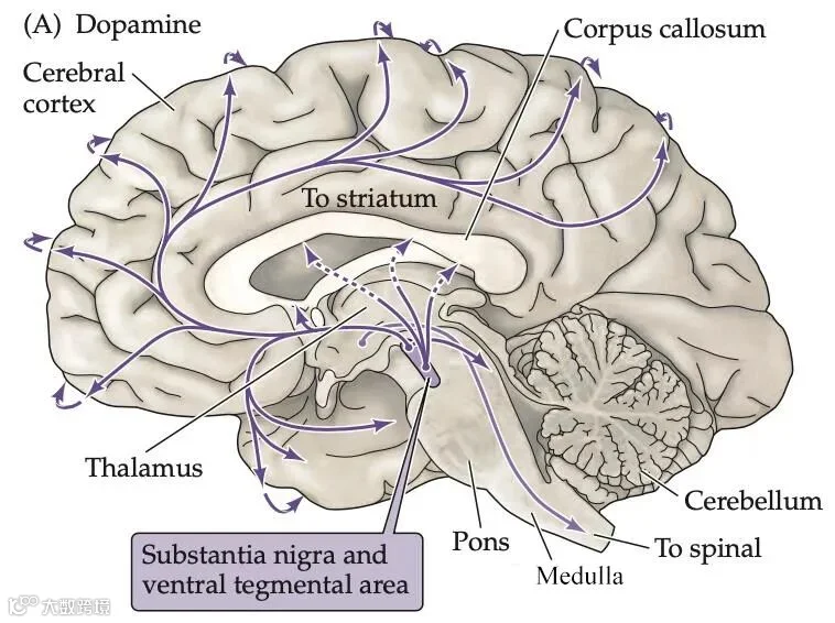 所以黑质-纹状体通路的多巴胺平衡对人体的运动调节至关重要,帕金森病的主要发病机理就是大脑黑质-纹状体的多巴胺通路失衡。