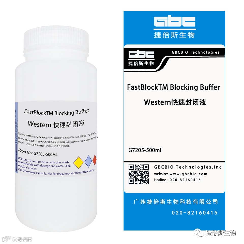 FastBlockTM Blocking Buffer是一种不含蛋白的快速高效Western封闭液,主要用于Western blot (WB)实验中PVDF膜或硝酸纤维素膜(nitrocellulose membrane, NC膜)的封闭,也可以用于Western实验中一抗或二抗的稀释。传统封闭缓冲液含有可在某些免疫检测系统中发生交叉反应的蛋白质,从而导致在高背景和减弱的信号中。FastBlockTM Blocking Buffer无蛋白质封闭缓冲液不含蛋白质,但在封闭板、膜和其他表面方面仍然非常有效