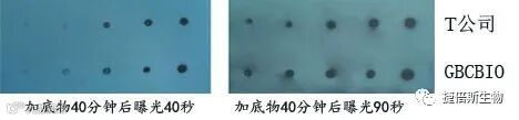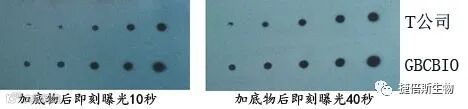 将GeneTex公司的HRP标记的抗鼠二抗(GTX213111-01)稀释10000、20000、40000、60000、80000、100000倍后,各取1μl点样于0.45μm的混合纤维素滤膜中,干透后(约10min)加入不同品牌的发光底物:T为SuperSignal West Pico Plus Substrate,GBCBIO为本公司产品。
