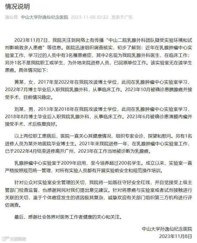 近日,一则“中山二院乳腺外科团队疑受实验环境和试剂影响致多人患癌”的消息广泛传播。中山大学附属第二医院乳腺外科专家苏士成陷入舆论漩涡,他实验室的3名博士以及博士后被曝纷纷患癌。