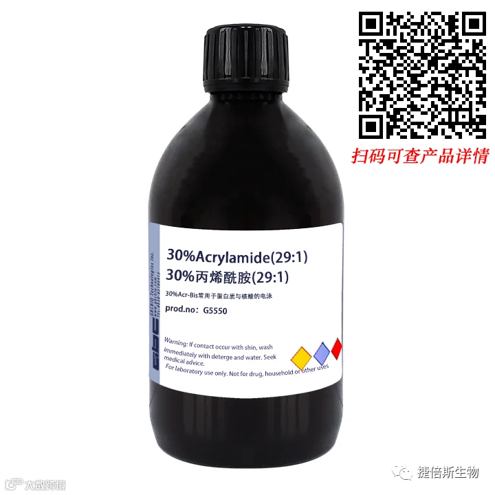 解决方案:捷倍斯生物(GBCBIO)生产的聚丙烯酰胺-G5550质量稳定可靠,使用方便无需直接接触毒性较强的丙烯酰胺粉末,而且有多种浓度比例可选择。