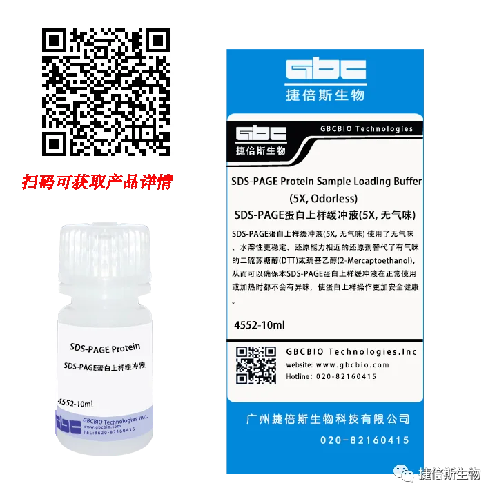 解决方案:捷倍斯生物(GBCBIO)的SDS-PAGE蛋白上样缓冲液(5X, 无气味)-4552使用了无气味、水溶性更稳定、还原能力相近的还原剂替代了有气味的二硫苏糖醇(DTT)或巯基乙醇(2-Mercaptoethanol),与常规的蛋白上样缓冲液的使用效果一致。