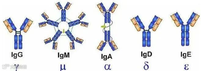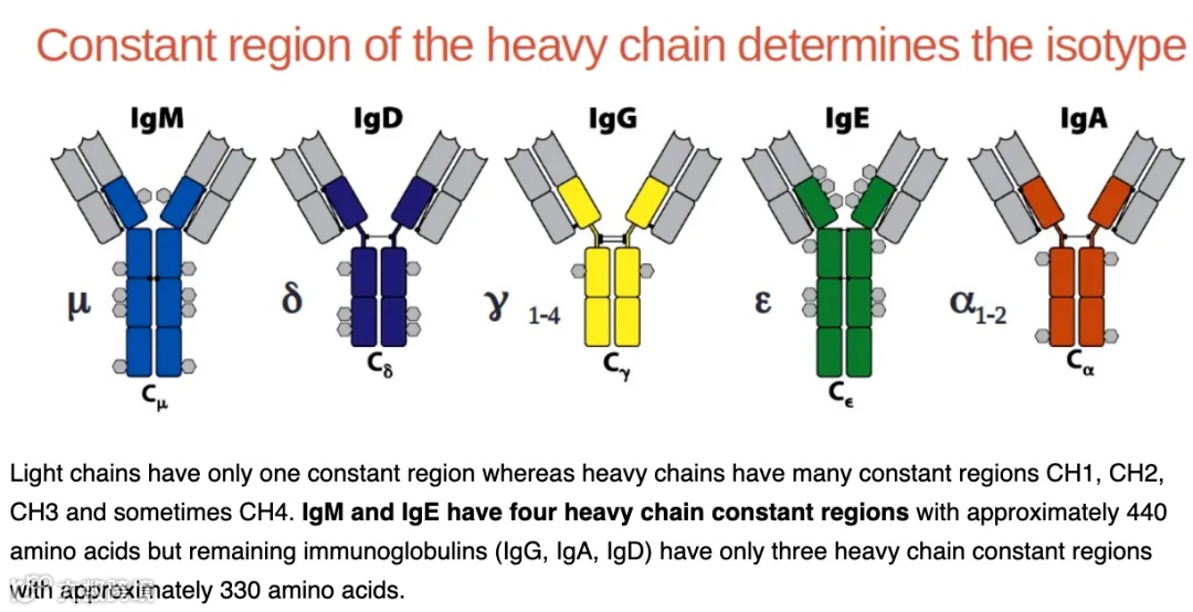抗体重链类型直接决定了抗体的类型,哺乳动物抗体重链可分为五类,分别以希腊字母γ、α、μ、δ、和ε表示,据此将抗体相应地分为IgG、 IgA、 IgM、IgD和IgE。α和γ大约含有450个氨基酸,μ和ε约含550个氨基酸;同时μ链和ε链含有5个肽环,γ链、α链、δ链含有4个肽环。