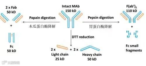 经胃蛋白酶酶切后裂解为1个完整F(ab)2片段和碎片化的Fc片段,F(ab’)2片段为双价,可同时结合两个抗原表位。