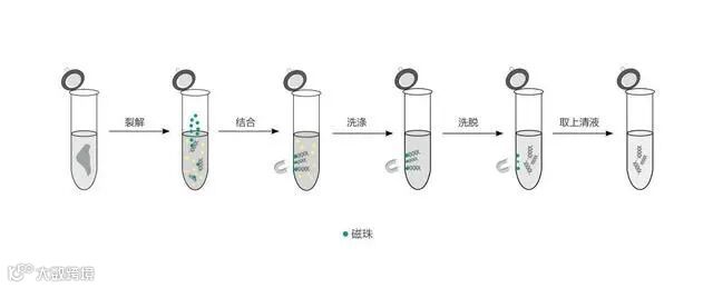 而基于磁珠法提取的商业试剂盒也得到广泛应用。这种试剂盒不需要任何有机溶剂,无需重复离心,目前可以从全血、血清、血浆、唾液、尿液、粪便、脑脊液、组织和细胞中提取高质量的DNA和RNA,且耗时更短、回收率更高。最显著的优势是可以通过机械设备实现提取过程自动化和无人源干扰。