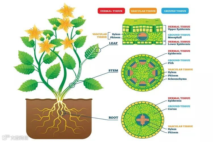 维管组织类似于动物的血管。它包括木质部和韧皮部。维管组织在植物内部运输水分和营养物质。