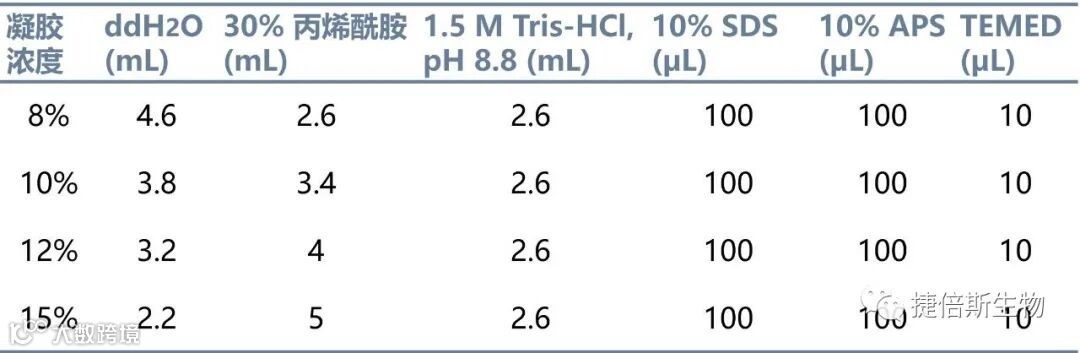 超纯水,30%丙烯酰胺,pH8.8Tris-HCl,pH6.8Tris-HCl,10%SDS,10%过硫酸铵(APS),TEMED,还有95%酒精(压胶用)。注意试剂的有效期,是否澄清透明,若有沉淀或晶体析出,请更换。30%丙烯酰胺注意避光4度保存。pH8.8Tris-HCl和pH6.8Tris-HCl容易出现沉淀,另外注意这两个试剂有两个浓度的,分别是1.0M和1.5M,根据你的配方表来买。10%SDS低温(4度以下)时容易结晶析出。APS化学性质活泼,常温下暴露于空气下容易变质失效,一般建议配好后分装冻于-20度冰箱。TEMED气味恶臭,挥发性强,具有神经毒性,使用时屏住呼吸,在通风的环境下使用,注意密闭避光保存于4度。