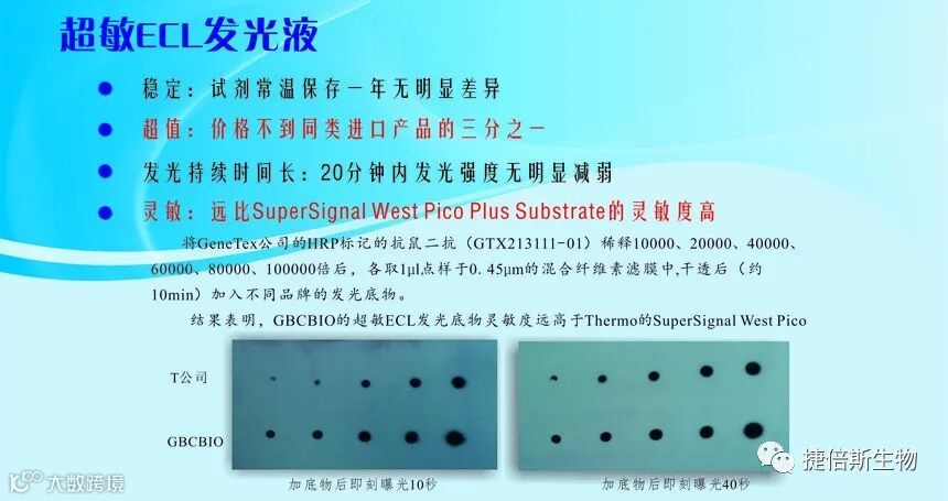 将GeneTex公司的HRP标记的抗鼠二抗(GTX213111-01)稀释10000、20000、40000、60000、80000、100000倍后,各取1μl点样于0.45μm的混合纤维素滤膜中,干透后(约10min)加入不同品牌的发光底物:T为SuperSignal West Pico Plus Substrate,GBCBIO为本公司产品。