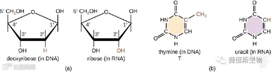 图:(a)核糖核苷酸含有戊糖核糖,而不是脱氧核糖核苷酸中的脱氧核糖。