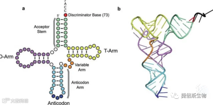 图:转移 RNA (tRNA) – (a) tRNA 在二维中表示为三叶草结构。(b) 在三个维度中,tRNA 折叠成 L 形,通过 tRNA Phe 结构 [PDB: 1HEZ; 此处显示的分子内碱基配对稳定。[20]]。在这两个图中,tRNA 结构元素都是彩色的:受体茎(绿色)、二氢尿苷(D)臂(紫色)、反密码子茎(浅蓝色)、反密码子(深蓝色的碱基 34、35、36)、可变臂(橙色)、T 型臂(黄色)和鉴别器底座(红色)。