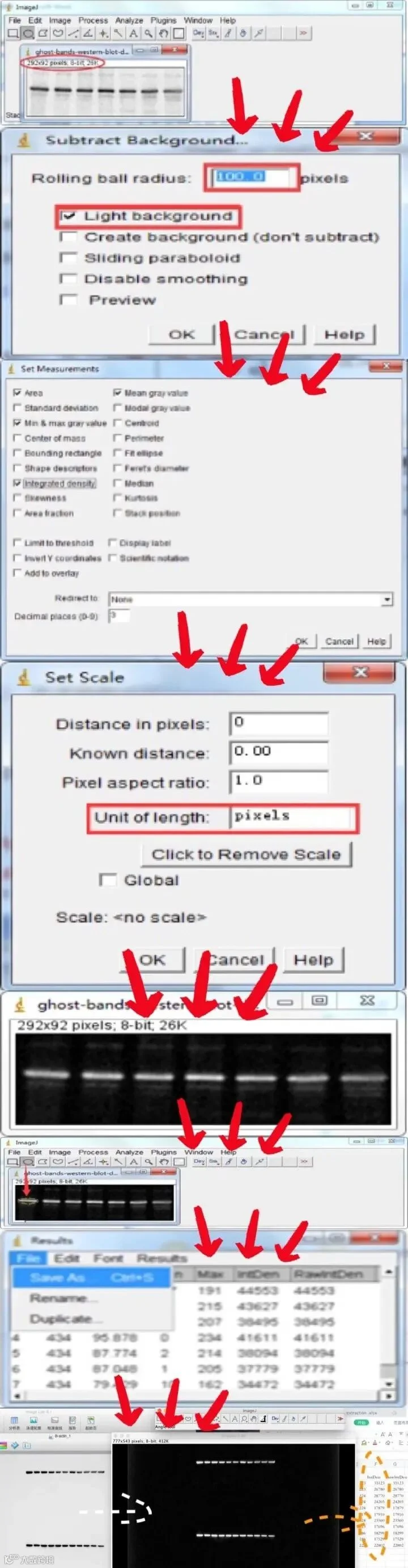 对于灰度值来说,标本制作以及染色时间长短,以及测量时照明光源电压的大小对其影响很大。而光密度是一个比值。是通过计算一张标本最亮区域的平均灰度值与该切片标本中待测目标的平均灰度值的比值,再根据数学公式计算而来的,所以受标本染色时间长短及照明光源电压关系很小。有研究实践显示,灰度值与光密度值二者之间存在着线性关系,都可以用来进行WB定量分析。同样,Image J软件进行WB条带定量分析时也存在两种方法,此处只列举一种方法,具体步骤如下(也可以看1-12的流程图):