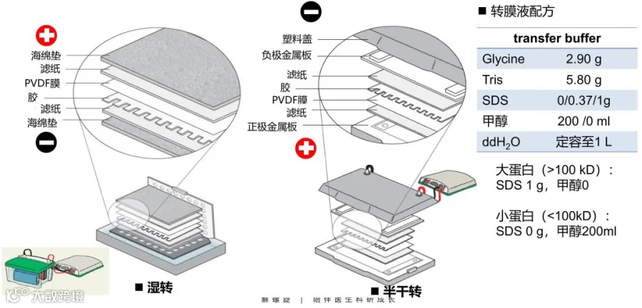 湿转:全部泡在大量转膜液里。三明治是垂直插在转膜槽里的,从负极到正极依次是:海绵垫、滤纸、胶、PVDF 膜、滤纸、海绵垫。