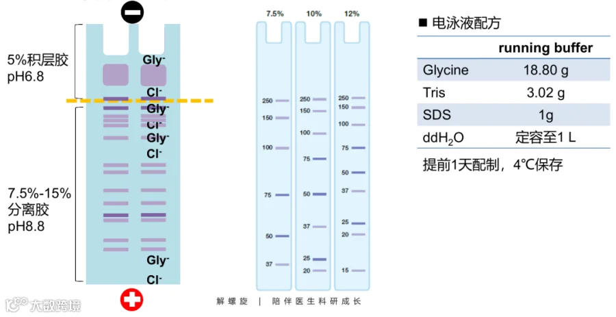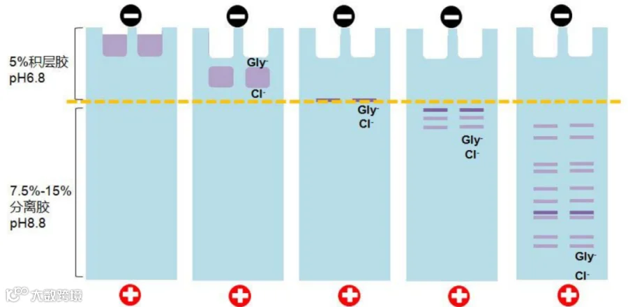 原理:样品在 5% 积层胶里会被压缩成一条细线,这是缓冲液中甘氨酸盐离子 Gly-和 Cl- 的作用。在积层胶里,Cl-跑在最前面,中间是蛋白样品,最后是 Gly-盐离子,Gly-和 Cl-之间形成一个电压梯度,压缩蛋白样品;到分离胶时,Gly-、Cl-跑在蛋白前面,蛋白样品脱离了电压梯度限制,开始按蛋白大小以不同速度泳动,从而按蛋白大小分离开来。电泳胶原理可参考:WB做了那么久 看了这篇终于把蛋白电泳的原理搞懂了!