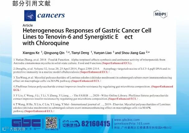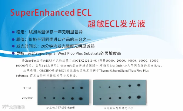 捷倍斯(GBCBIO)公司生产的超敏ECL化学发光液(G)灵敏度极高,比DAB显色的灵敏度至少高1000倍,比Pierce公司的SuperSignal West Pico Substrate的灵敏度高10倍,对于辣根过氧化物酶的检测灵敏度可以达到飞克级。